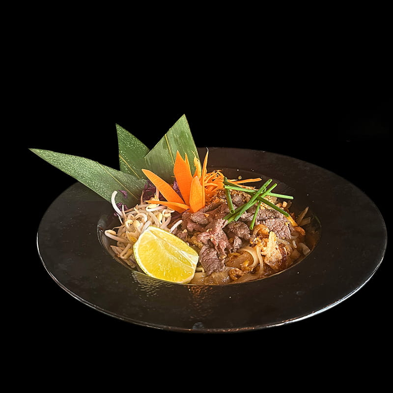Nouille de riz, boeuf, oeuf, oignon, ail, pousse de soja, légumes